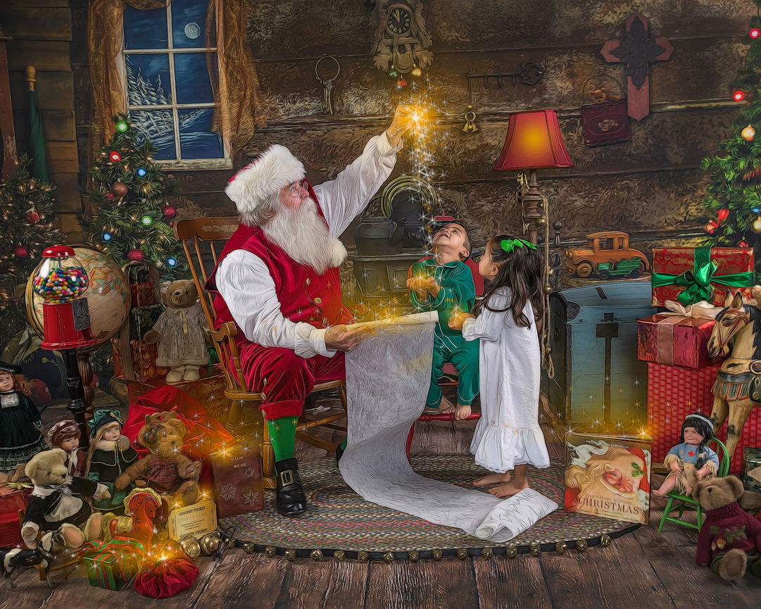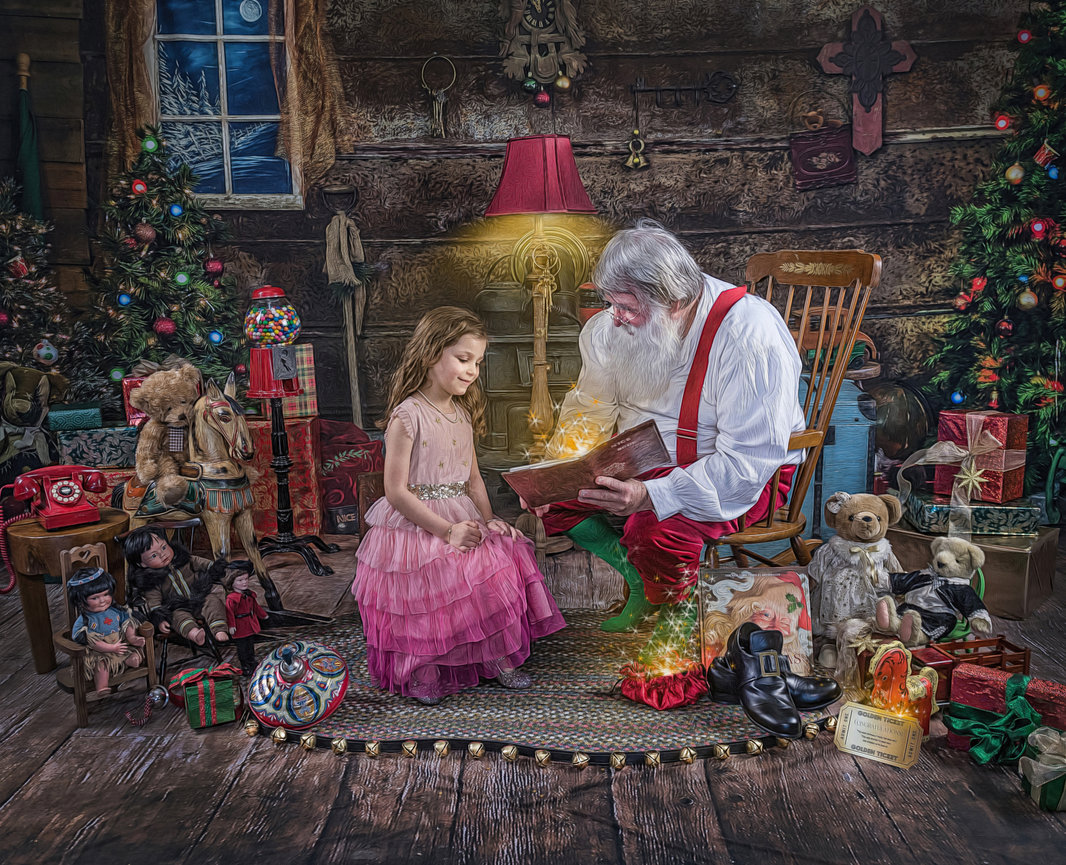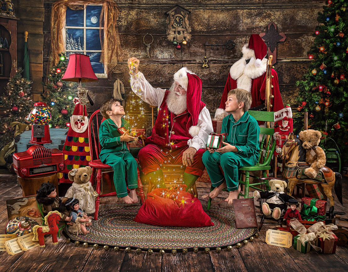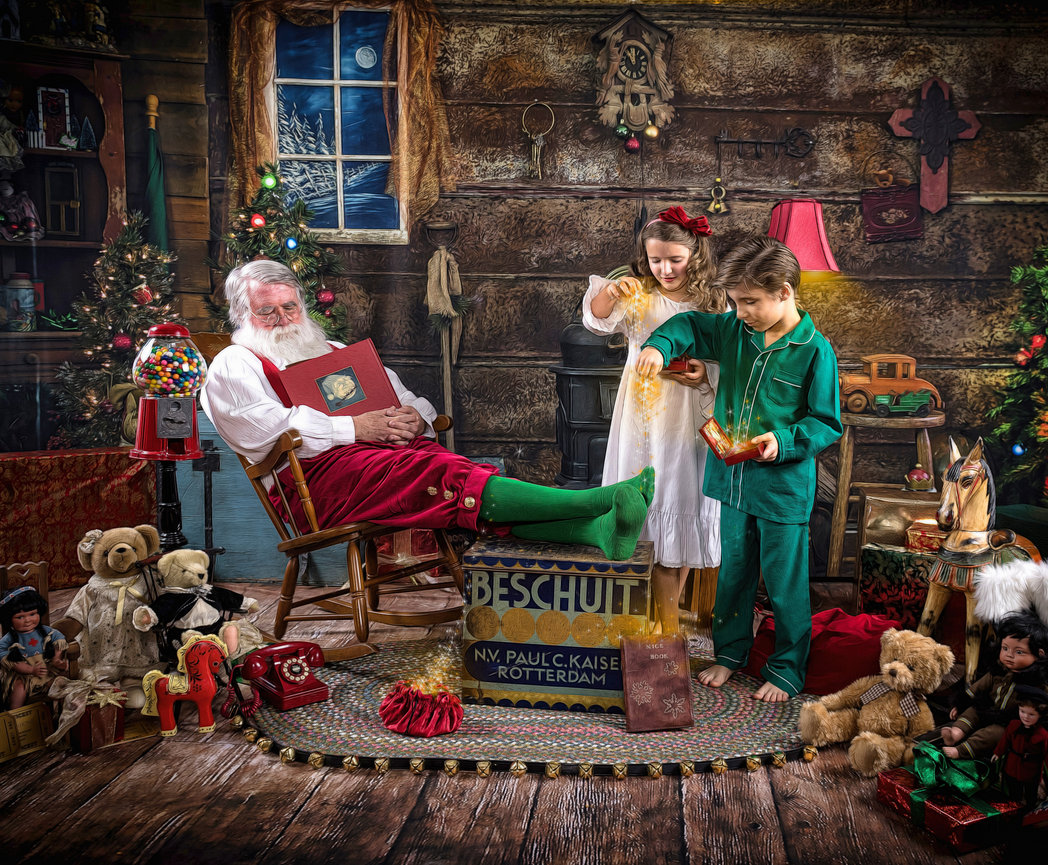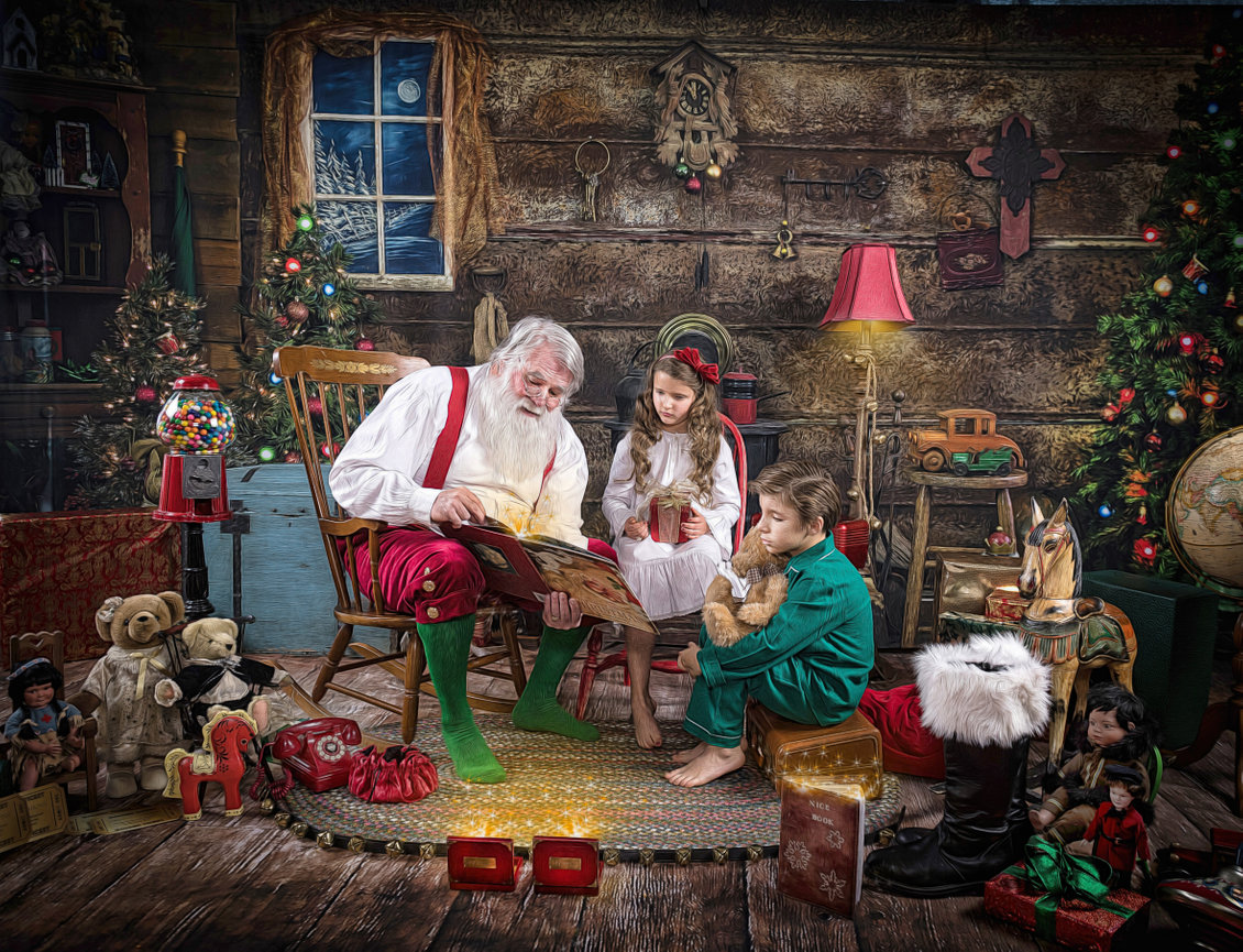 The Premiere Santa Experience is a unique opportunity for your children to spend quality time with Santa. The sessions will result in nostalgic fine art portraits featuring your children. We will create the most beautiful timeless pieces showcasing your children’s interactions with Santa. The session is comprised of a storybook progression of images which consist of finding each child's name in Santa's Nice Book, sharing milk and cookies, a phone call from Bernard the head elf, checking their wish list written in the Elf-A-Bet, looking into santa's toy bag, the Magic Box and magic dust, Santa sharing a verse from the Bible about the birth of Christ (optional), Magic Paint, and Santa showing child on the globe where he lives. Each session is approximately 40 minutes long, private, and personalized for your child. Each interaction with our professional Santa is encouraged in such a way to craft beautiful photographic moments with which to create your custom art pieces. Children of all ages are welcome, siblings alone or together. The session fee is $400 and includes the use of pjs (however you are welcome to bring your own), 40 min. storybook session and $100 credit towards cards, prints or wall portraits.