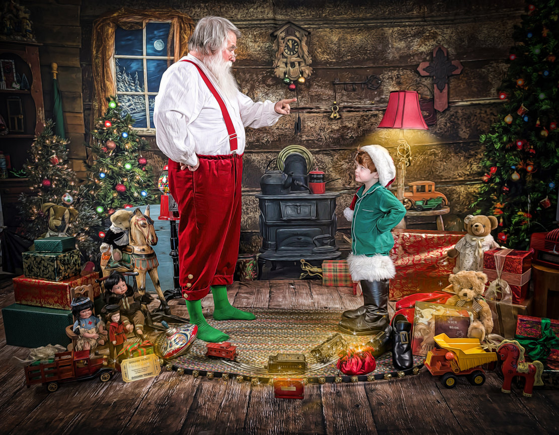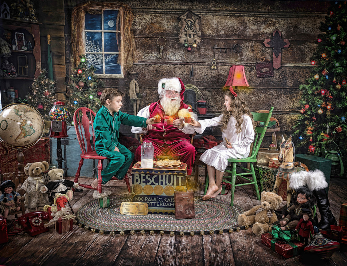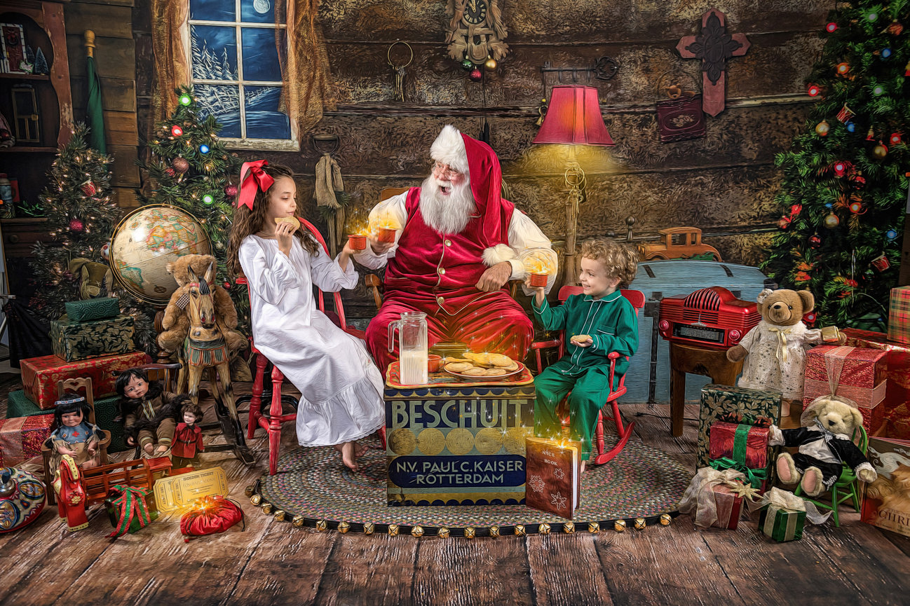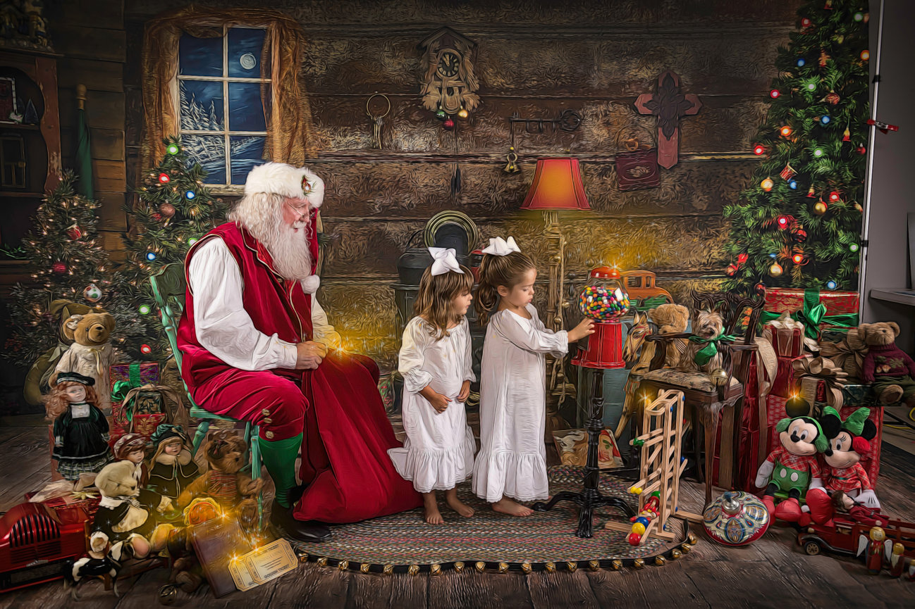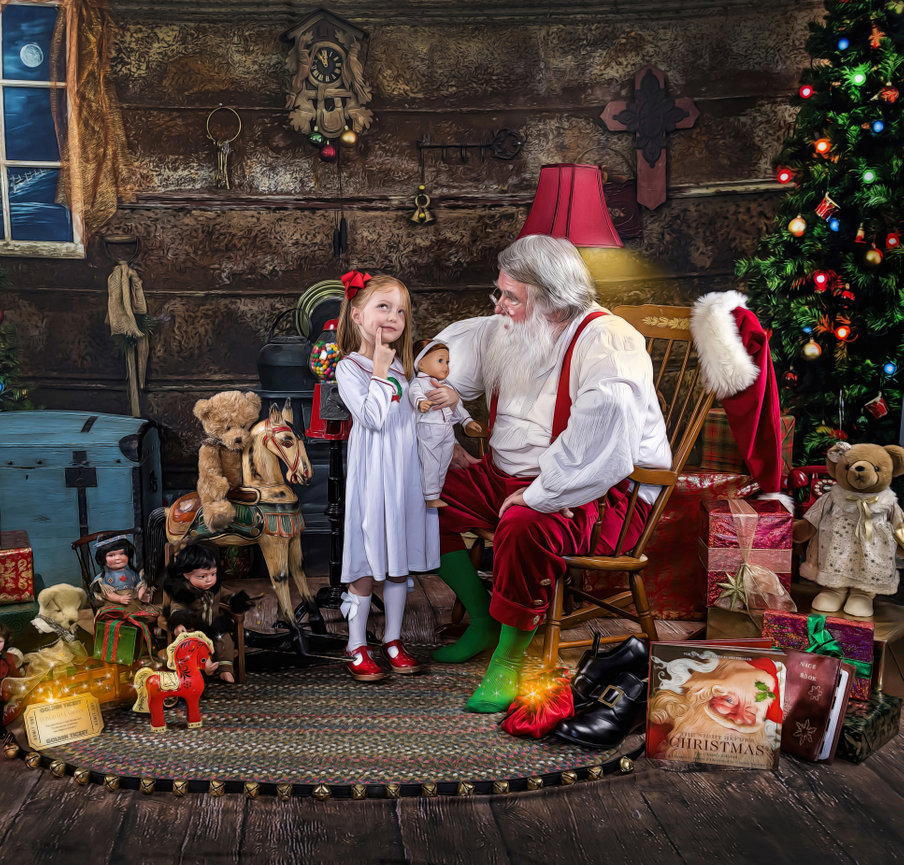 The Premiere Santa Experience is a unique opportunity for your children to spend quality time with Santa. The sessions will result in nostalgic fine art portraits featuring your children. We will create the most beautiful timeless pieces showcasing your children’s interactions with Santa. The session is comprised of a storybook progression of images which consist of finding each child's name in Santa's Nice Book, sharing milk and cookies, a phone call from Bernard the head elf, checking their wish list written in the Elf-A-Bet, looking into santa's toy bag, the Magic Box and magic dust, Santa sharing a verse from the Bible about the birth of Christ (optional), Magic Paint, and Santa showing child on the globe where he lives. Each session is approximately 40 minutes long, private, and personalized for your child. Each interaction with our professional Santa is encouraged in such a way to craft beautiful photographic moments with which to create your custom art pieces. Children of all ages are welcome, siblings alone or together. The session fee is $400 and includes the use of pjs (however you are welcome to bring your own), 40 min. storybook session and $100 credit towards cards, prints or wall portraits.