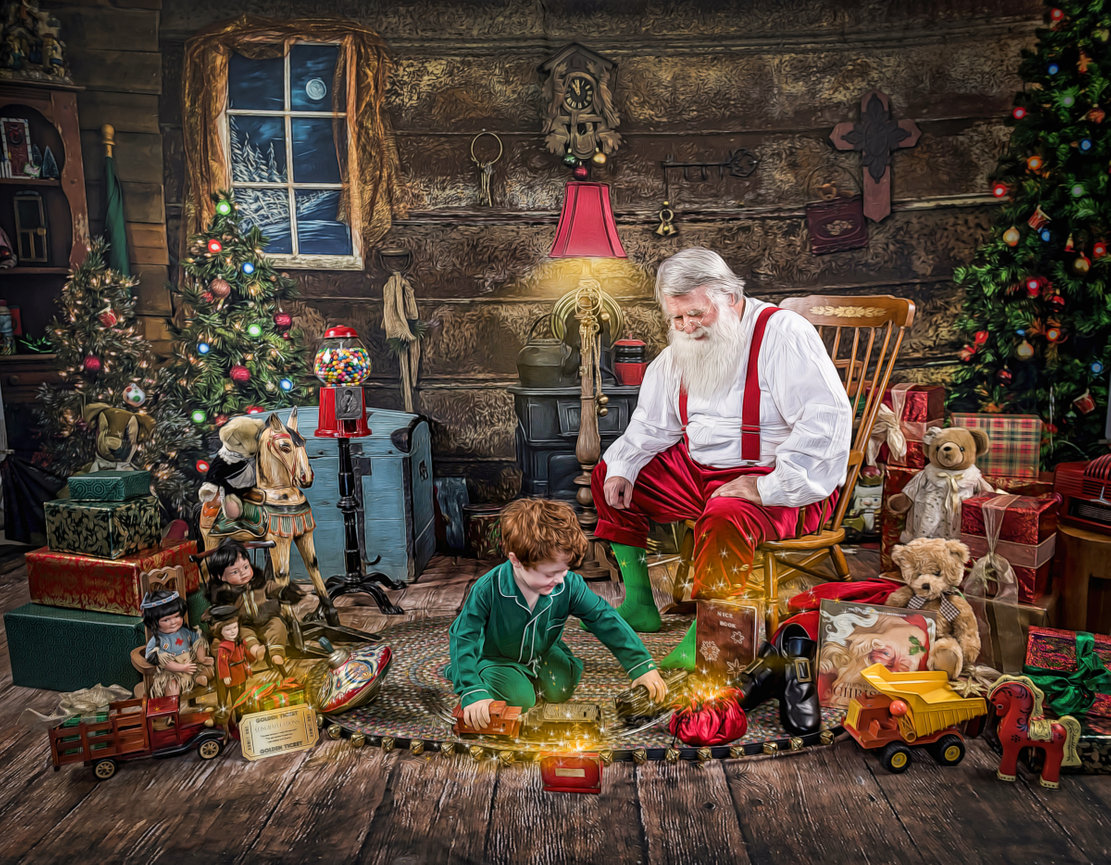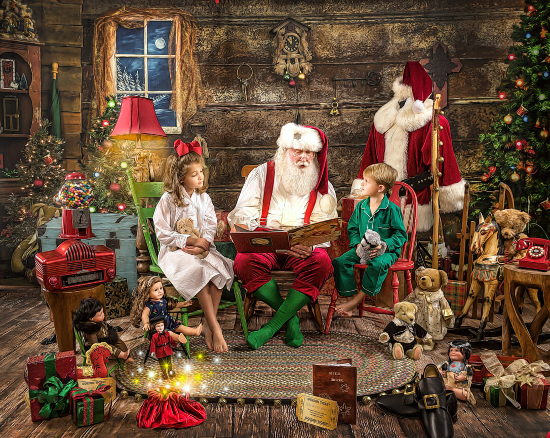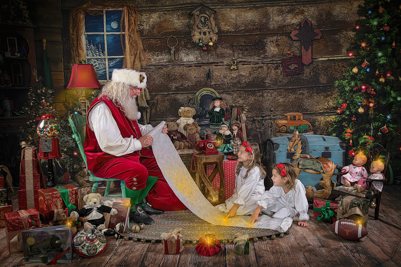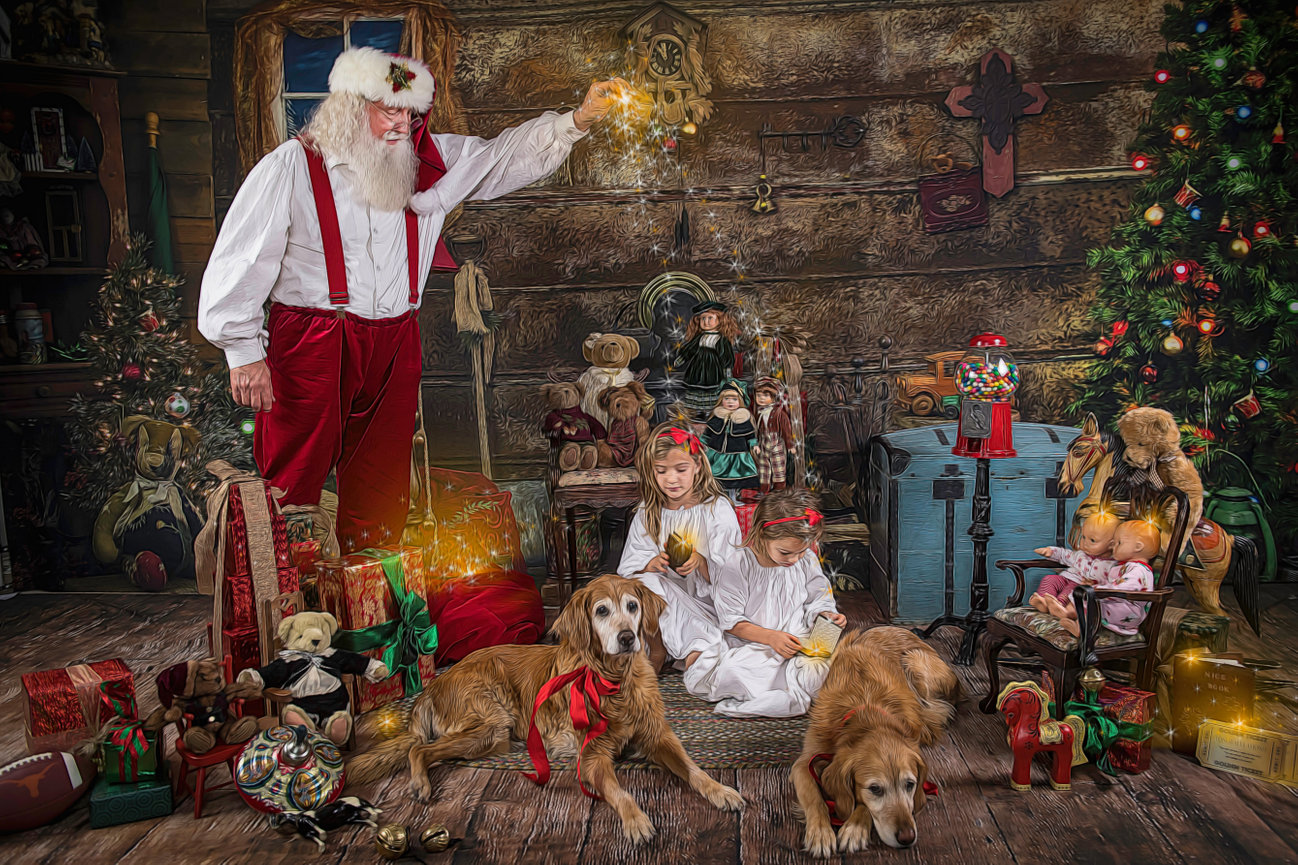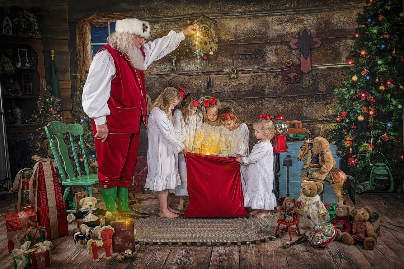 The Premiere Santa Experience is a unique opportunity for your children to spend quality time with Santa. The sessions will result in nostalgic fine art portraits featuring your children. We will create the most beautiful timeless pieces showcasing your children’s interactions with Santa. The session is comprised of a storybook progression of images which consist of finding each child's name in Santa's Nice Book, sharing milk and cookies, a phone call from Bernard the head elf, checking their wish list written in the Elf-A-Bet, looking into santa's toy bag, the Magic Box and magic dust, Santa sharing a verse from the Bible about the birth of Christ (optional), Magic Paint, and Santa showing child on the globe where he lives. Each session is approximately 40 minutes long, private, and personalized for your child. Each interaction with our professional Santa is encouraged in such a way to craft beautiful photographic moments with which to create your custom art pieces. Children of all ages are welcome, siblings alone or together. The session fee is $400 and includes the use of pjs (however you are welcome to bring your own), 40 min. storybook session and $100 credit towards cards, prints or wall portraits.